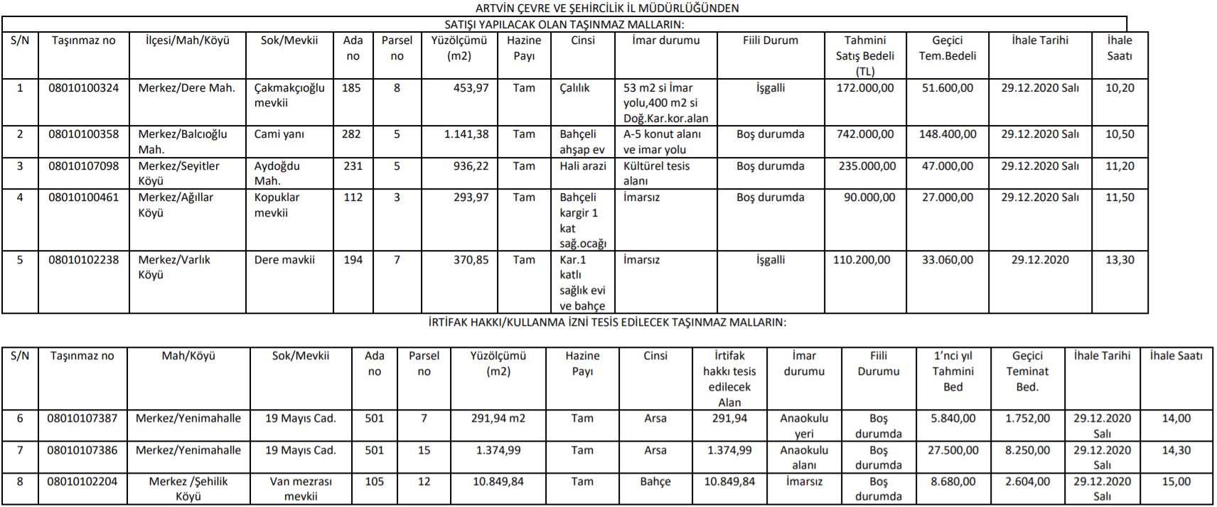 Aşağıda İlçesi, Mah./Köyü mevkii, tapu kaydı ve nitelikleri belirtilen taşınmazlardan 1-2-3- 4 ve 5 sıra numaralarında gösterilen taşınmazların satışları 2886 sayılı Kanunun 45’nci maddesi uyarınca Açık Teklif Usulü ile 6-7 ve 8 sıra numaralarında gösterilen taşınmazlar üzerinde konut ve enerji hariç olmak üzere eğitim, sağlık, turizm, sanayi, organik tarım, organik hayvancılık, sosyal ve kültürel tesisler vb yapılmak üzere 2886 sayılı Kanunun 51/g maddesi uyarınca 30 (Otuz) yıl süreli bağımsız ve sürekli irtifak hakkı tesis edilmesi için satış ve irtifak hakkı tesis ihaleleri hizalarında belirtilen tarih ve saatlerde Çevre ve Şehircilik İl Müdürlüğünce Şehitlik Köyü, Zemin kat/ARTVİN adresinde bulunan Çevre ve Şehircilik İl Müdürlüğünde yapılacaktır.
