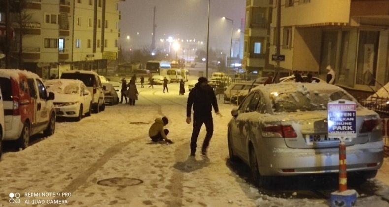 Meteoroloji Genel Müdürlüğü tarafından yapılan değerlendirmede Ankara’da akşam saatlerinde başlayan kar yağışı şiddetini arttırarak etkili oldu. Sokağa çıkma kısıtlamasını rağmen çocuklar dışarı çıkarak doyasıya eğlendi.