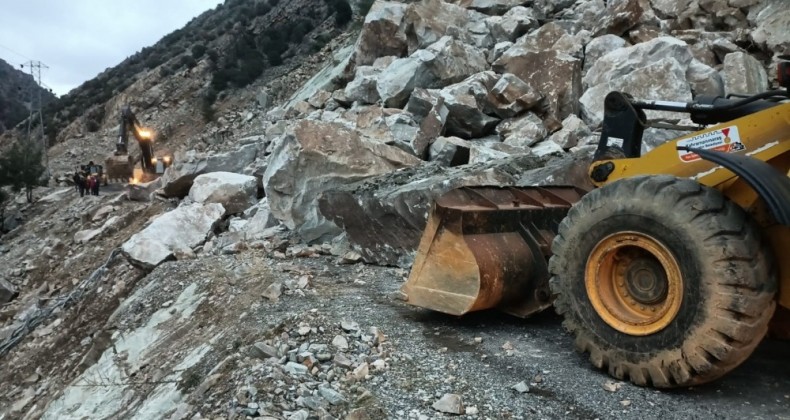 Heyelan sebebiyle kayalarla kapanan yol, Kahramanmaraş Büyükşehir Belediyesi ekiplerince açılıyor.