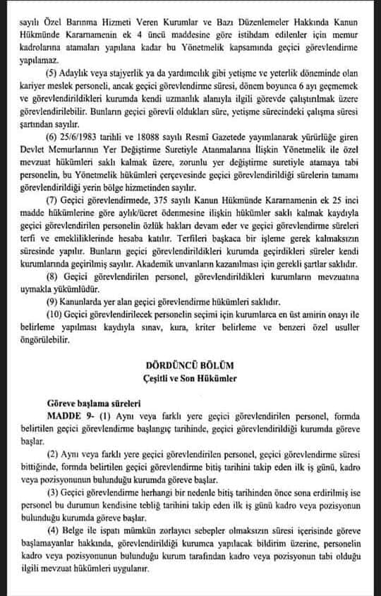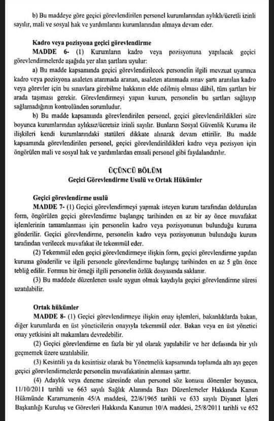 Ancak adaylık, stajyerlik ya da yardımcılık gibi yetişme ve yeterlik döneminde olan kariyer meslek personeli, geçici görevlendirme süresi dönem boyunca 6 ayı geçmemek ve görevlendirildikleri kurumda kendi uzmanlık alanıyla ilgili görevde çalıştırılmak üzere görevlendirilebilecek. Bu kişilerin geçici görevli oldukları süre, yetişme sürecindeki çalışma süresi şartından sayılacak.