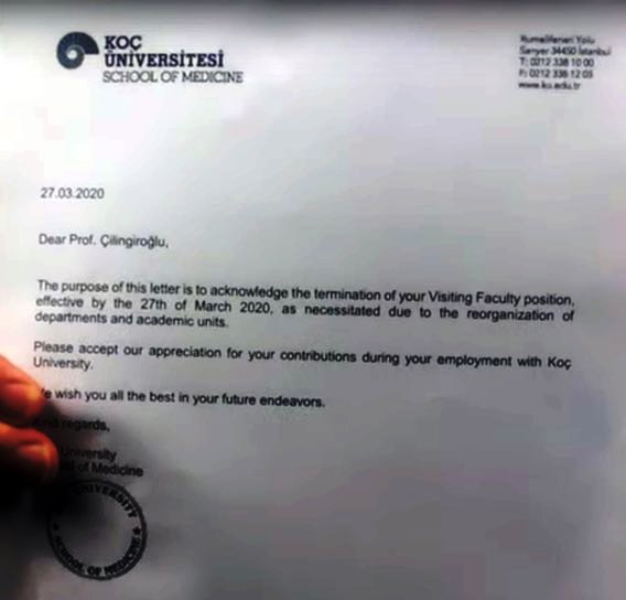 03 Mart 2020 tarihinde saat 21:00’de CnnTürk ekranlarında yayınlanan “Akıl Çemberi” isimli tartışma programında; korona virüsü ile mücadele konuları tartışılırken, Kardiyolog Prof Dr. Mehmet Çilingiroğlu yayın esnasında kendisine Koç Üniversitesinden mesaj geldiğini ve şu an da yayın esnasında işten kovulduğunu belirtti.