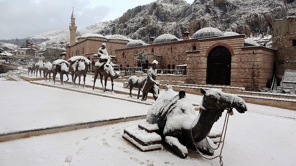 Tokat’ta kar yağışı ile birlikte tarihi çarşıda bulunan deve heykelleri beyaza büründü.