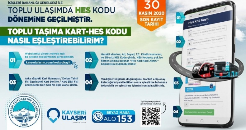 İçişleri Bakanlığı tarafından yayınlanan “Şehir İçi Toplu Ulaşımda HES Kodu Sorgulaması” başlıklı genelge uyarınca toplu ulaşım araçlarını kullananların toplu taşıma kartlarını Hayat Eve Sığar (HES) kodlarıyla eşleştirme işlemleri Kayseri’de 30 Kasım’da sona erecek.