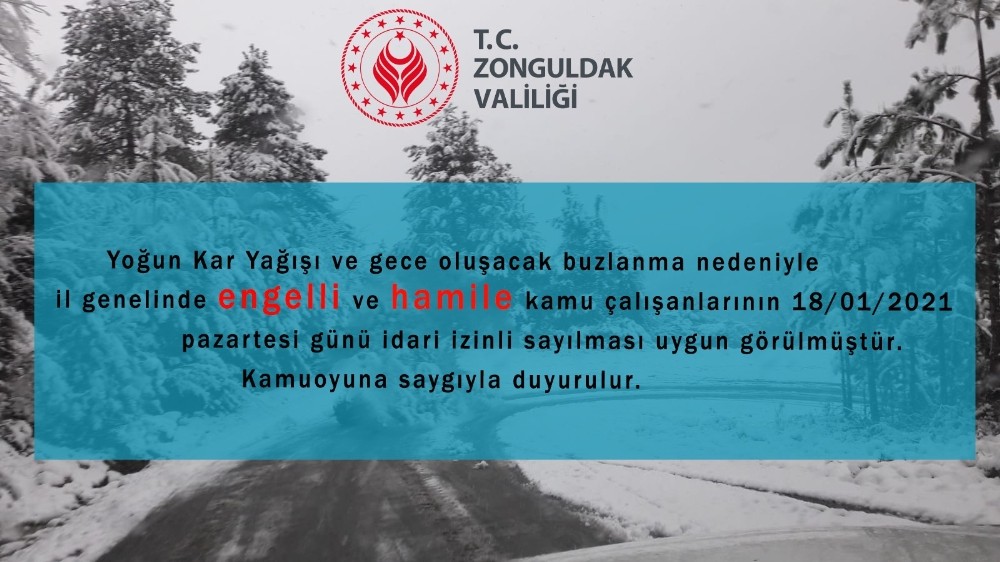 Zonguldak Valiliği de yoğun kar yağışı ve gece oluşacak buzlanma sebebiyle il genelinde engelli ve hamile kamu çalışanlarının 18 Ocak 2021 Pazartesi günü idari izinli sayılmasınını uygun görüldüğünü açıkladı.